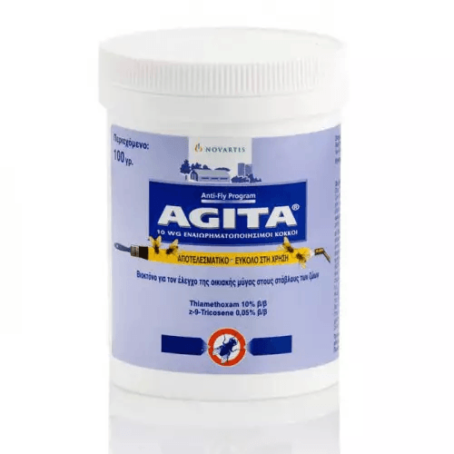 Agita 100g este o momeală feromonală pentru muște destinată uzului profesional, creată pentru eliminarea rapidă a muștelor adulte în ferme, grajduri, adăposturi și spații industriale. Formula concentrată, cu feromoni sexuali și atractanți alimentari, atrage intens insectele și determină consumul imediat al substanței active, ducând la eliminarea rapidă a muștelor.