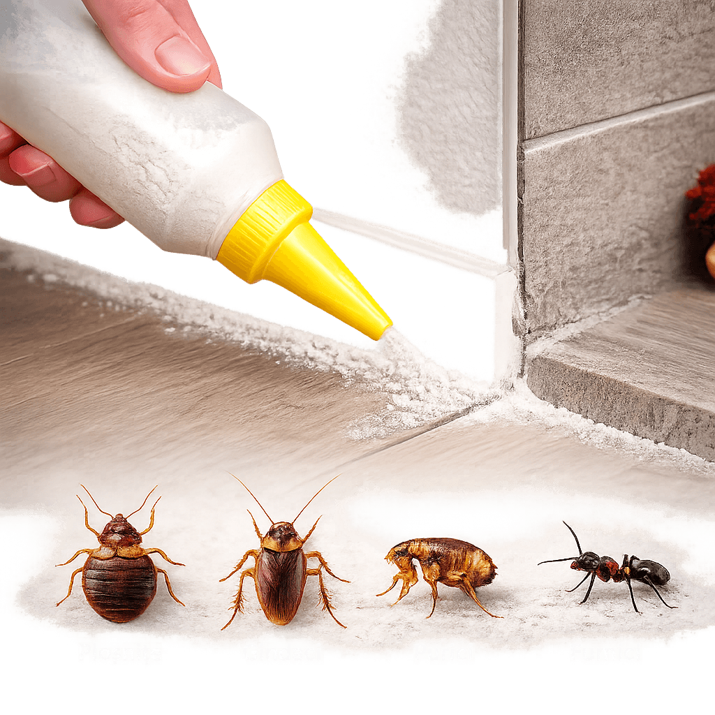 Диатомитовый порошок эффективен как средство от постельных клопов, тараканов на кухне, блох, муравьев и чешуйниц. Его наносят вдоль плинтусов, в щели стен, под кроватями, возле мебели, за бытовой техникой, под раковинами и в технических зонах.