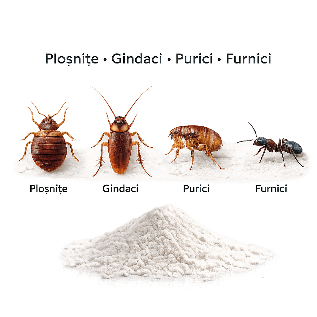 Диатомитовый порошок (диатомовая земля) — это натуральное средство против клопов, тараканов, блох, муравьев и других ползающих насекомых, широко используемое в квартирах, домах, подвалах и технических помещениях. В Республике Молдова продукт активно ищут как экологичную альтернативу химическим инсектицидам, особенно для длительной профилактики.